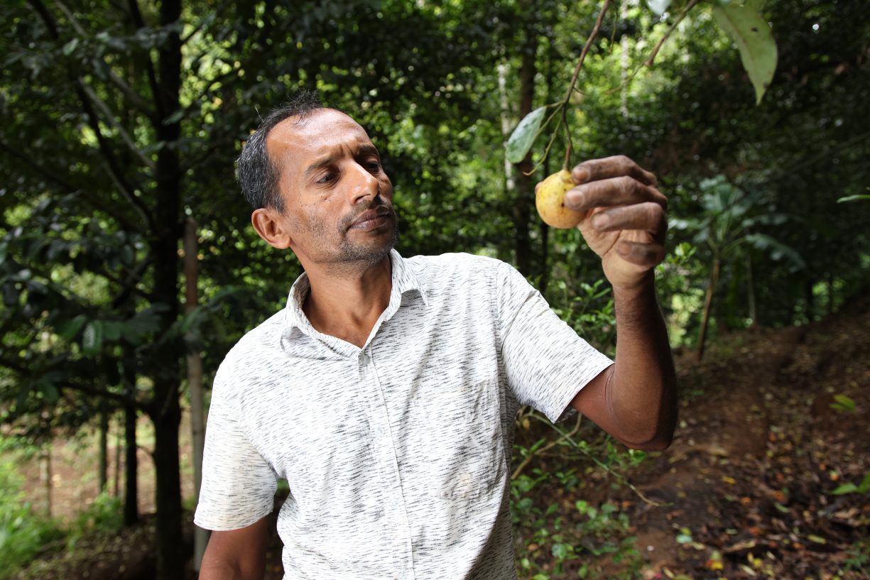 A Sri Lankan farmer inspects the fruit of a nutmeg tree – the seed inside is this classic spice, surrounded by a layer of red mace. Photo credit: Parelelo.[/caption]