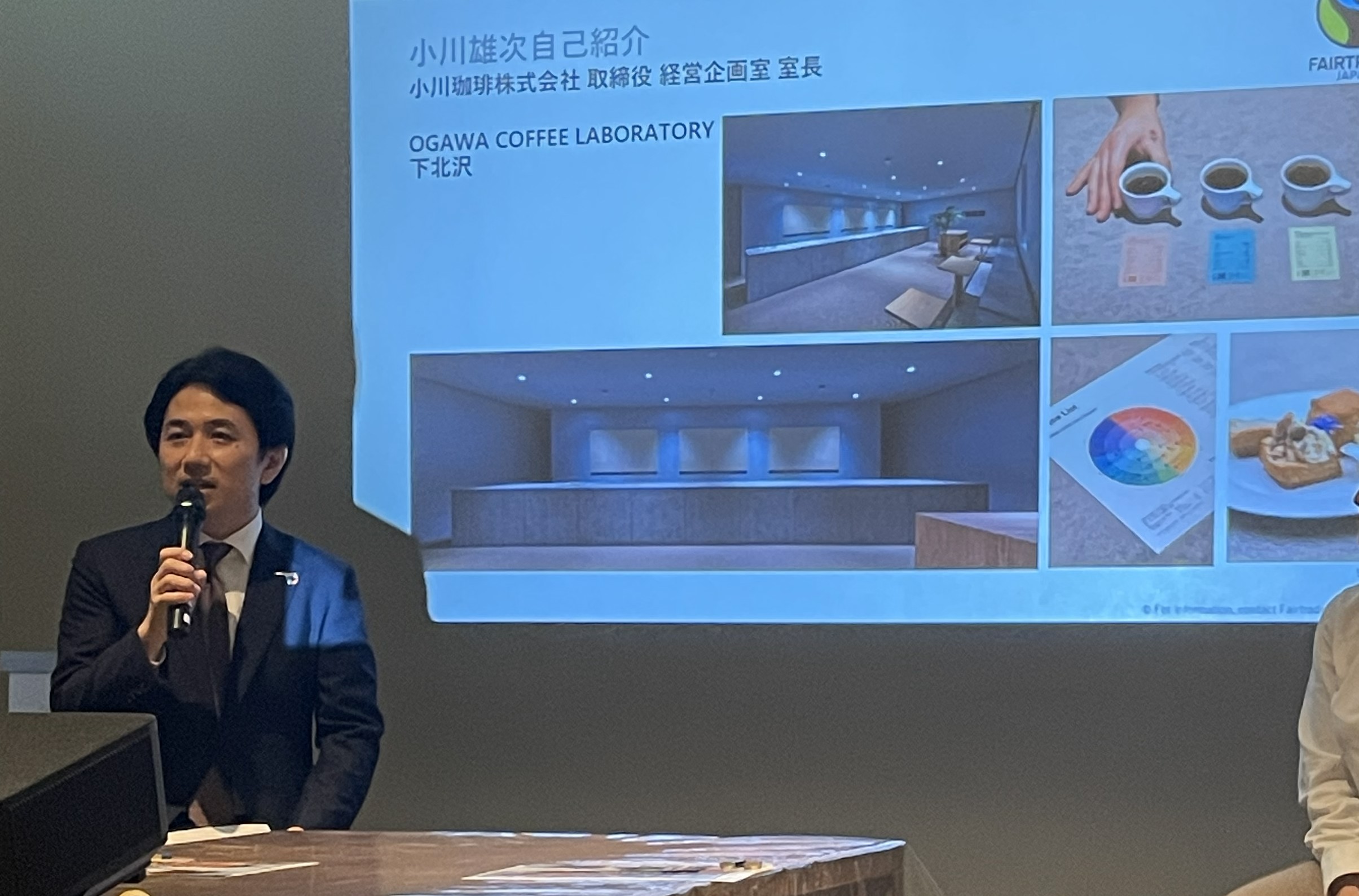 体験型企画展(11月13日〜16日開催@下北沢reload)とのコラボ企画として、11月14日、フェアトレード・ジャパンは、OGAWA COFFEE LABORATORY下北沢にてトークイベント「サステナブルを語る夜 生産者とつながるコーヒー時間」を開催しました。小川珈琲株式会社の協力のもと、同社取締役 経営企画室 室長の小川雄次氏と、フェアトレード中南米生産者組織(CLAC)の理事でメキシコのコーヒー生産者であるSilvia Herrera(シルビア・エレーラ)をゲストに迎え、気候変動がコーヒーに与える影響やフェアトレードの取り組みについて語っていただきました。