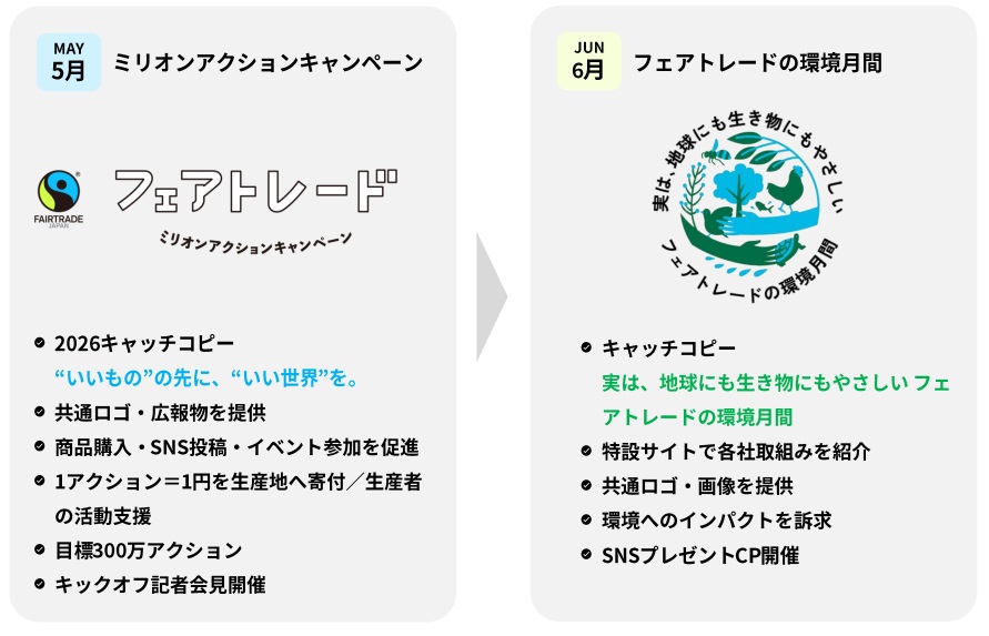 フェアトレード・ジャパンは、今年も気候変動とフェアトレードに関する国内最大規模の啓発キャンペーンとして、フェアトレード月間の5月に「ミリオンアクションキャンペーン2026」を、環境月間の6月に「フェアトレードの環境月間」を開催いたします。