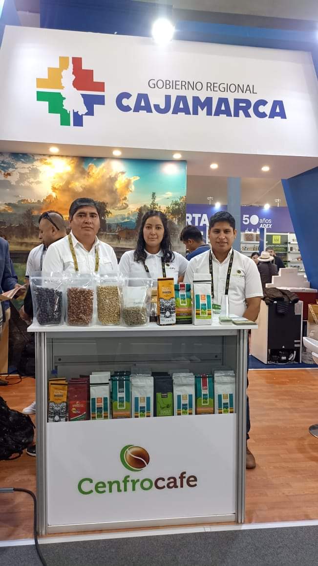 Photo: ハビエル(左)と同僚たちー2023年カハマルカ地方政府の旗の下でコーヒー製品を展示するCENFROCAFEのブースで