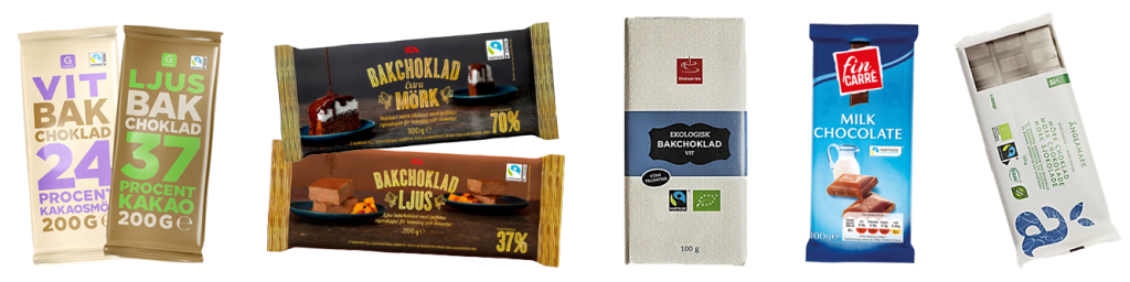 Fairtrade-märkt bakchoklad finns bland annat från Garant, Änglamark och Ica.