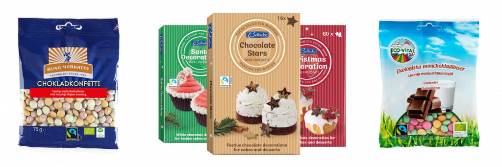 Få omedelbar julkänsla i dina bakverk med de små chokladdekorationerna från Lidl i form av tomtar, stjärnor eller pepparkaksgubbar. Vill du dekorera ditt pepparkakshus med chokladlinser så finns det Fairtrade-märkta från Kung Markatta och Eco-Vital.
