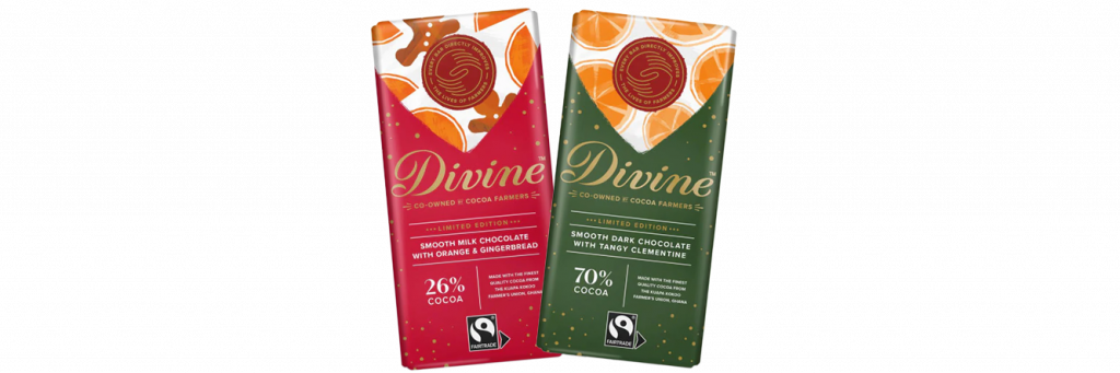 Årets julsmaker från Divine är här! Välj mellan mörk choklad med smak av clementin och ljus choklad med smak av apelsin och pepparkaka.