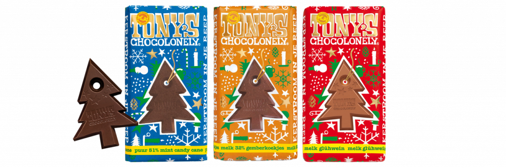 De här juliga chokladkakorna från Tony’s Chocolonely har en julgran i mitten som du kan hänga upp i granen (eller äta direkt!). Finns i smakerna glögg, pepparkaka och polkagris.