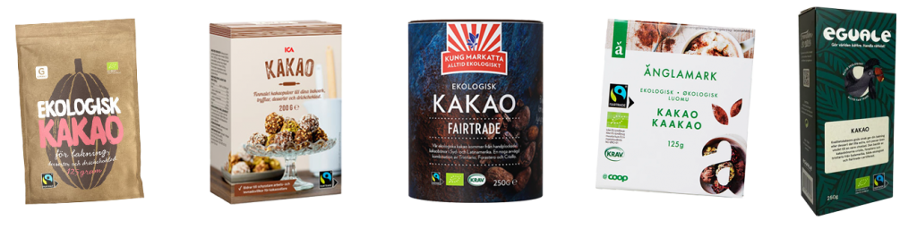 Fairtrade-märkt kakao finns bland annat från Garant, Ica, Kung Markatta, Änglamark och Eguale.