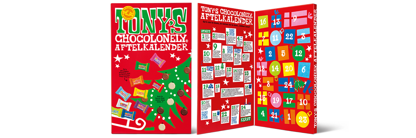 Tony’s Chocolonely grundades 2005 efter att tre journalister hade granskat kakaobranschen och upptäckt utbredd exploatering av arbetskraft på kakaoodlingar i Västafrika. De bestämde sig för att lansera sin egen choklad på marknaden för att visa att man kan göra på andra sätt. I årets julkalender får du en mix av vit, ljus och mörk choklad i olika smaker.