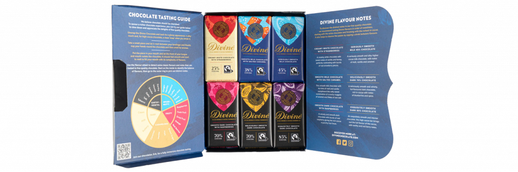 En vacker ask med 12 små chokladkakor i 6 olika smaker från Divine. I asken finns också instruktioner för chokladprovning.