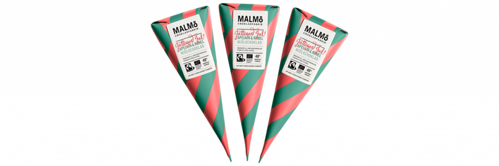 Vem skulle inte bli glad för de här goda chokladknapparna i fin strut från Malmö Chokladfabrik? ”Jättegod jul” består av mjölkchoklad med smak av apelsin och kanel.