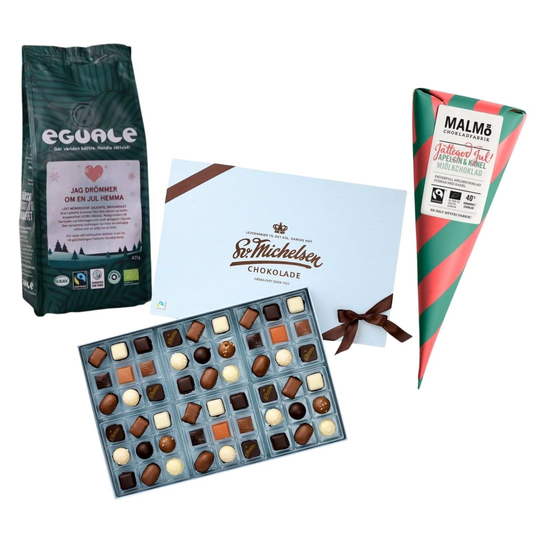 Ätbara julklappar är också en god idé! Satsa exempelvis på Fairtrade-märkt kaffe eller kakao – såsom julkaffe från Eguale, pralinaskar från Svend Michelsen eller en God jul-chokladstrut från Malmö chokladfabrik.