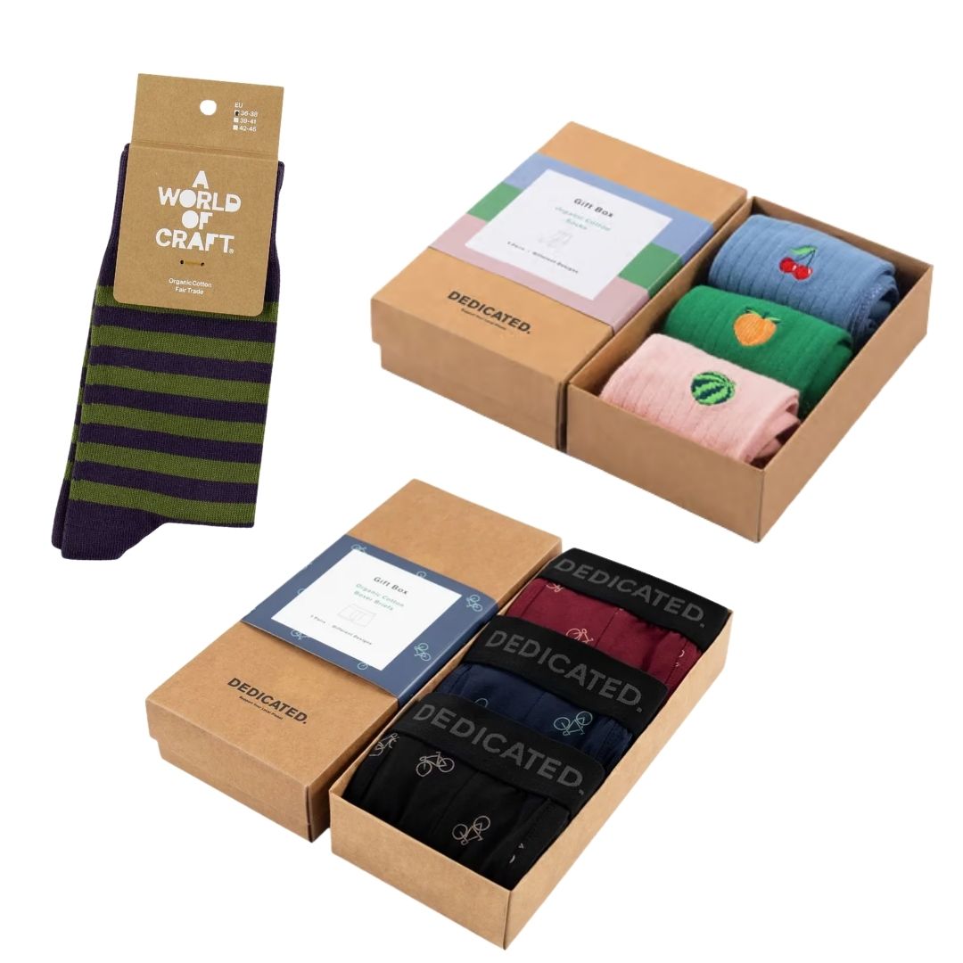 Du hittar strumpor och underkläder i Fairtrade-märkt och ekologisk bomull hos A World of Craft och Dedicated*, med olika motiv och färger.
