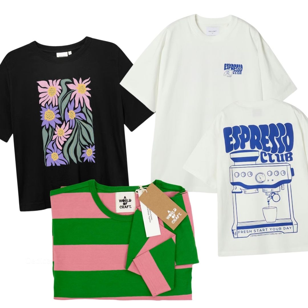 Det finns många olika sorters T-shirts och tröjor att välja bland som är tillverkade av Fairtrade-märkt och ekologisk bomull. Hos Dedicated finns många tryckta T-shirts i både dam- och herrstorlekar samt randiga t-shirts och långärmat hos A World of Craft. Det finns också Fairtrade-märkta t-shirts i herrstorlek hos Carlings.