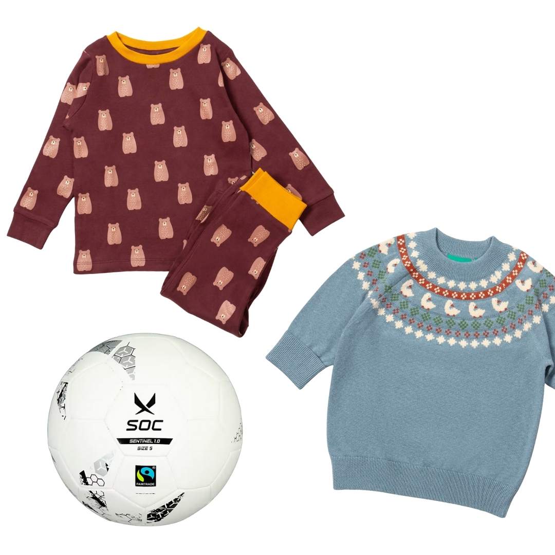 Klappar för de små finns också som Fairtrade-märkt! Du hittar till exempel Fairtrade-märkta sportbollar hos Stadium och barnkläder i olika storlekar hos Little Green Radicals i ekologisk och Fairtrade-märkt bomull (på bild: pyjamas och stickad tröja)